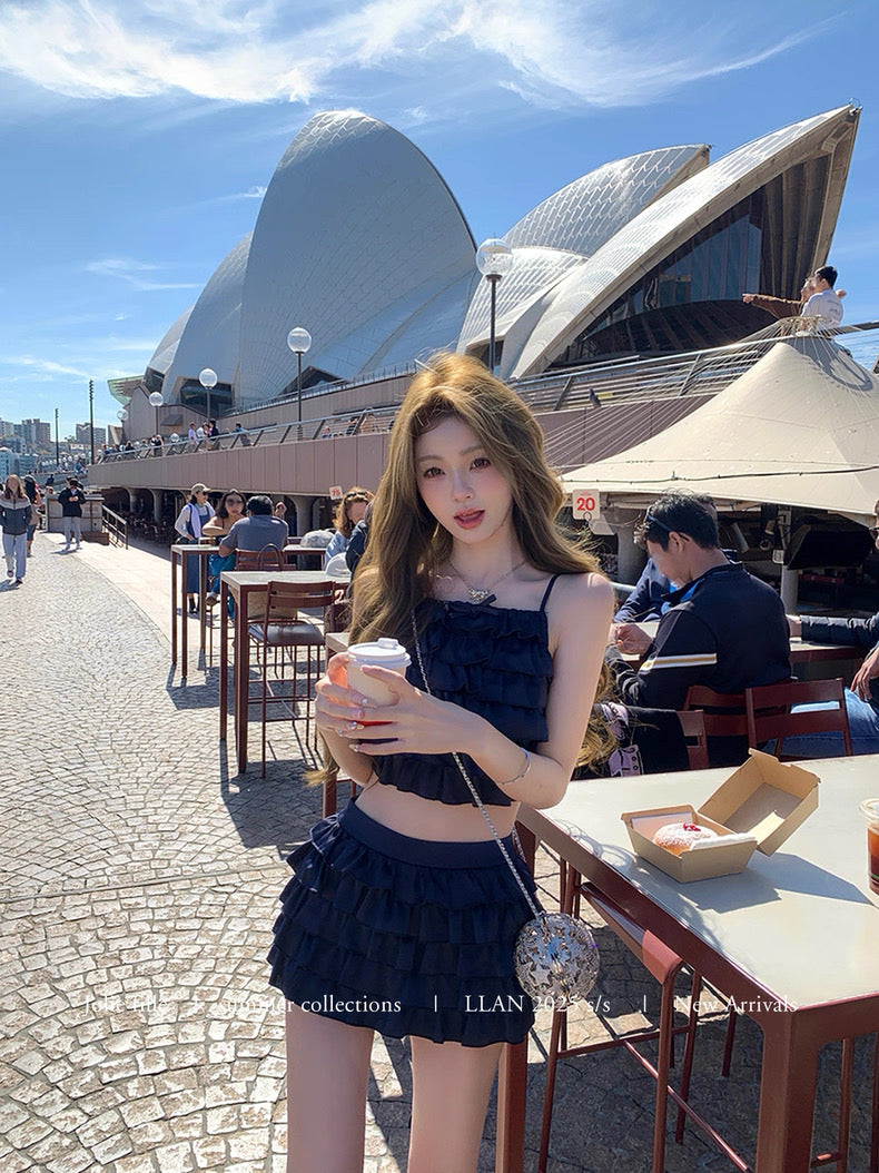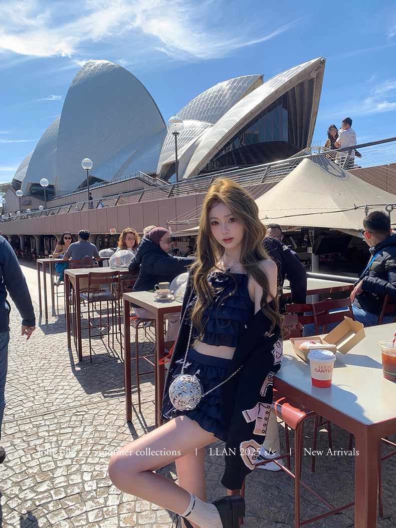 深みのあるネイビーカラーで大人っぽく引き締めたセットアップ。