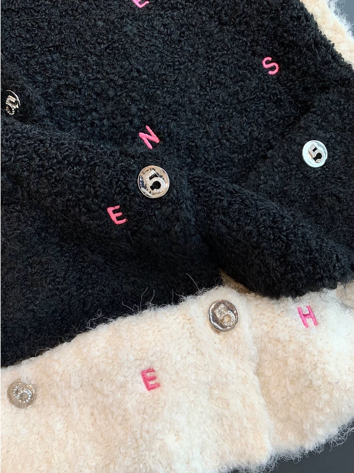 全体に散りばめられたピンクのロゴ刺繍が、