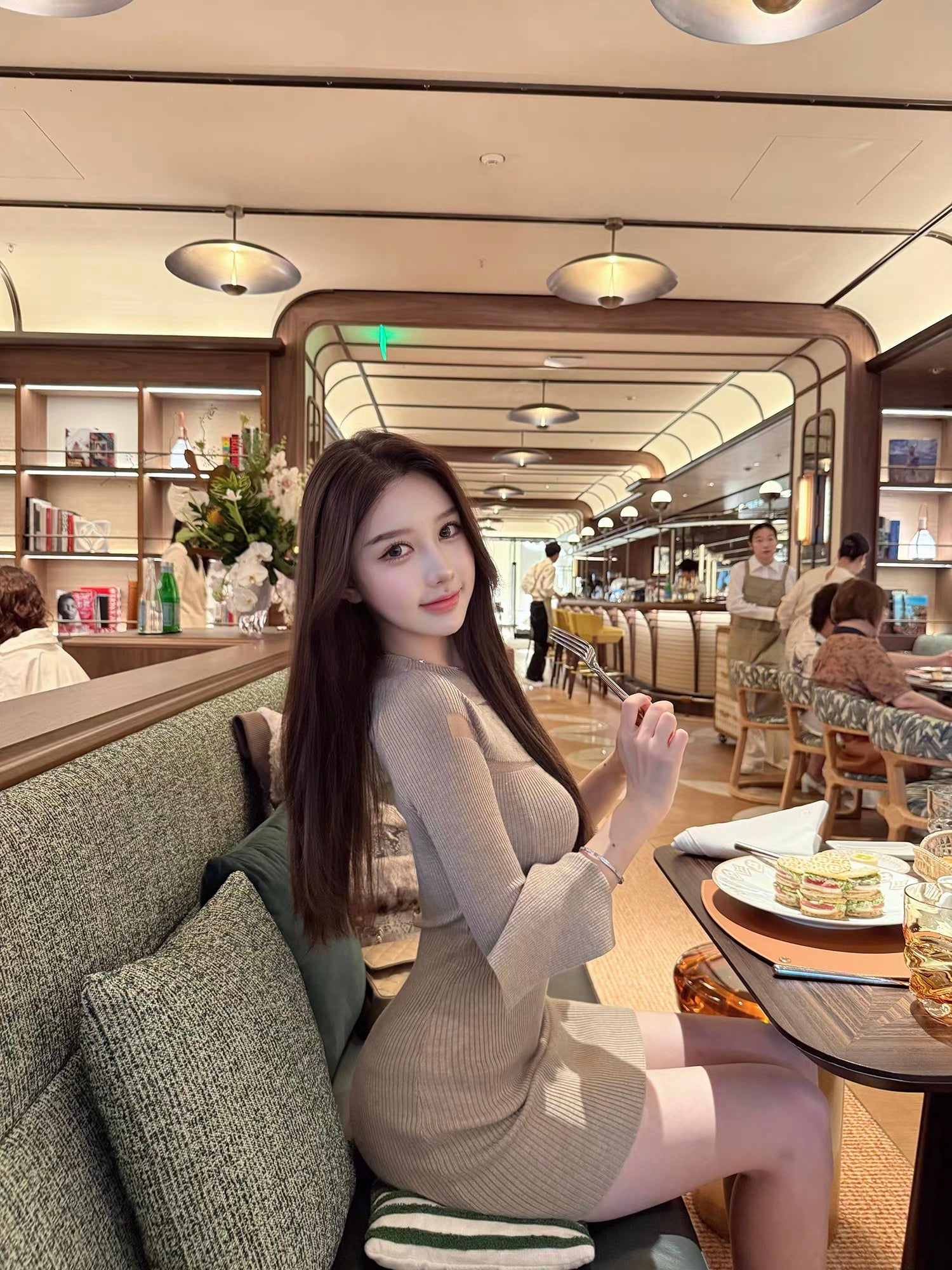 なめらかにフィットするリブニットが、女性らしいカーブを自然に引き立てながらも、