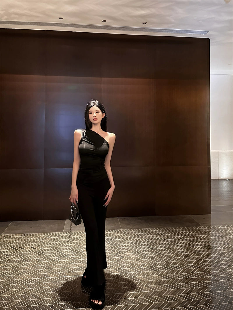 ワンショルダーのデザインが肩のラインを際立たせ、