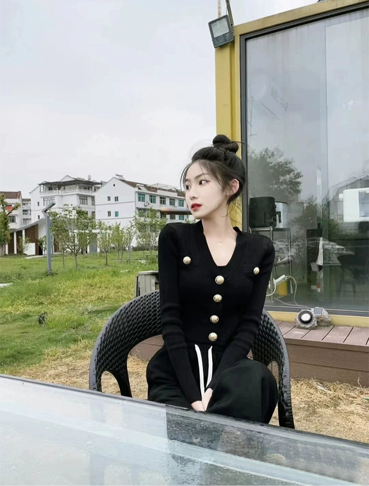 金ボタンがさりげなく輝く、クラシックなリブニットカーディガン。