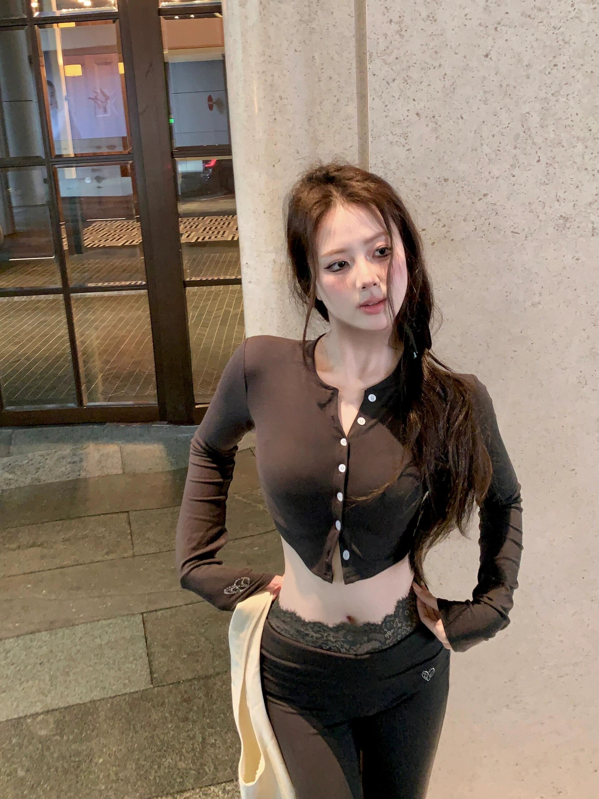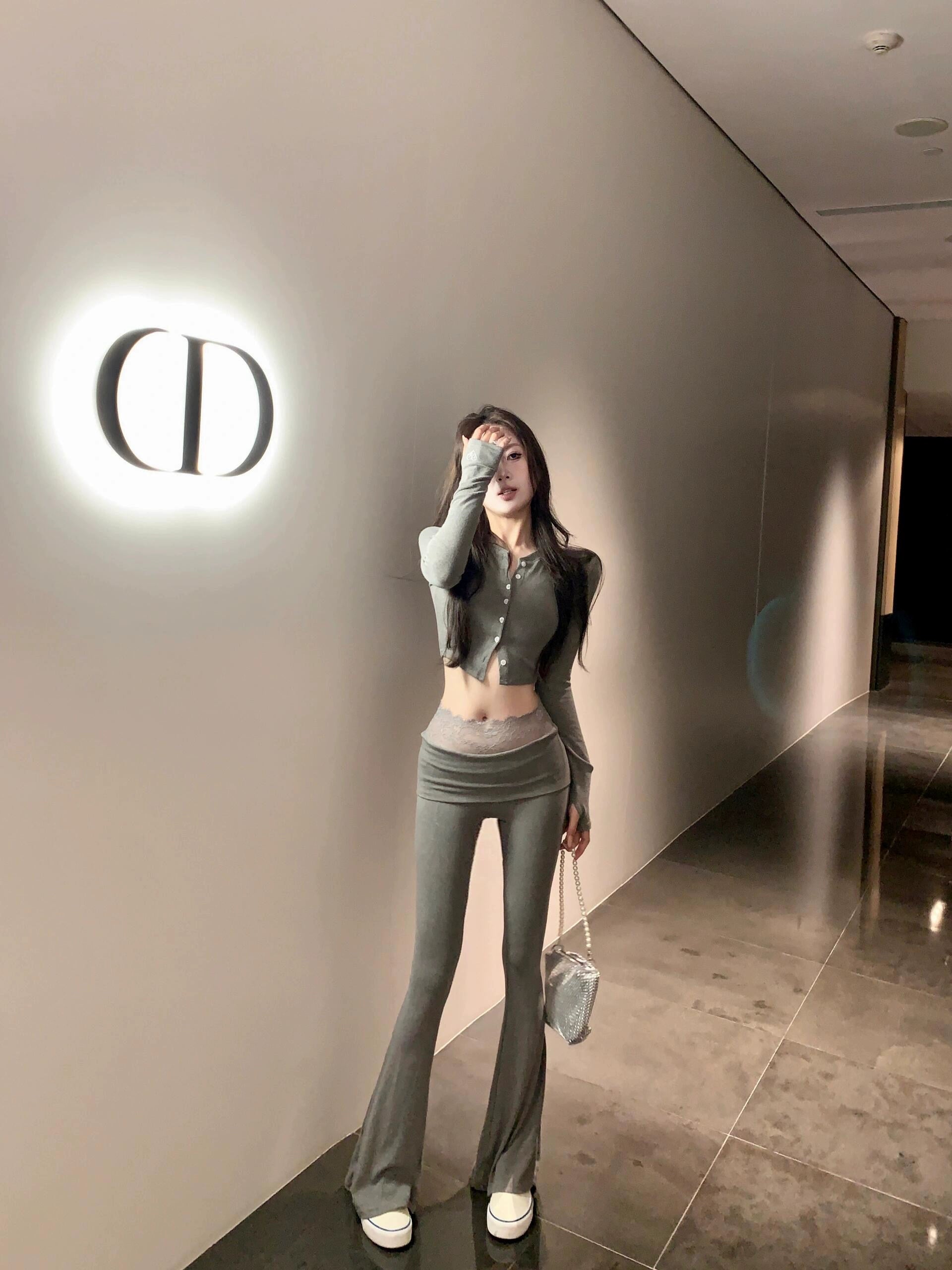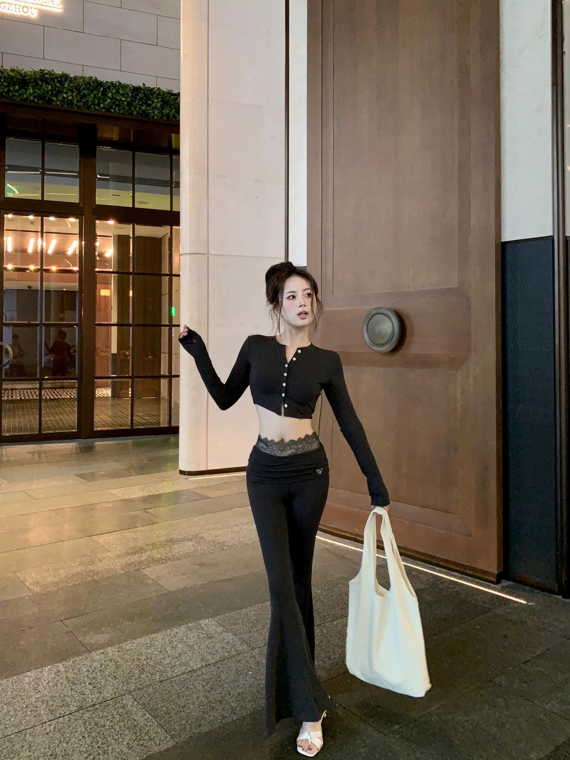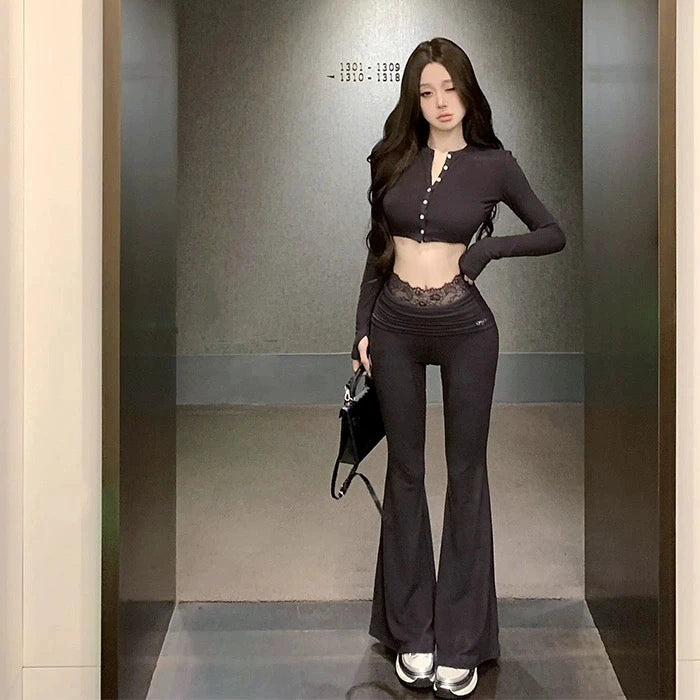 クロップド丈のトップスとハイウエストフレアパンツが、