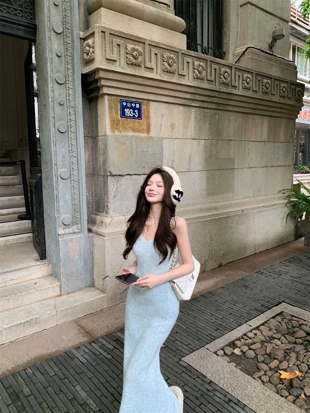 Vネックラインとロング丈のバランスがエレガント。