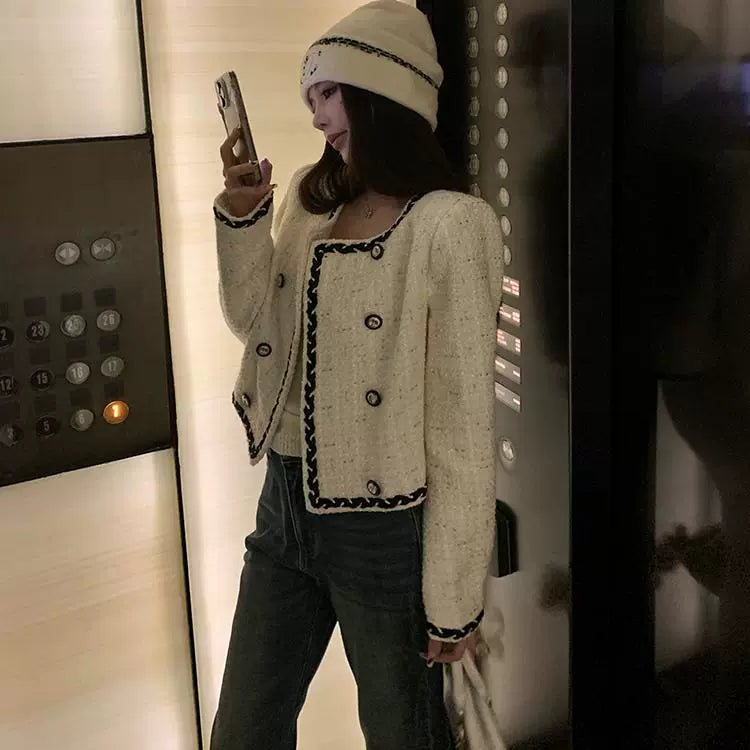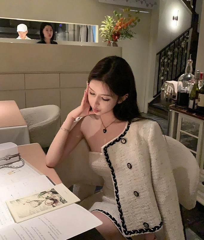 上品なツイードジャケット&ミニワンピースのセットアップ。