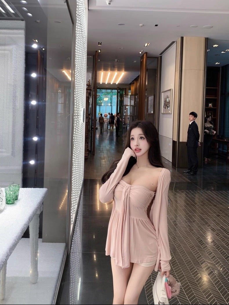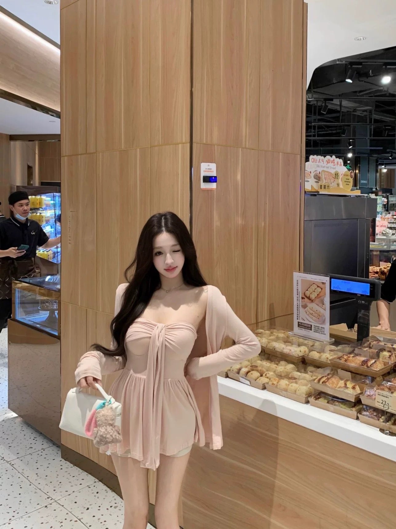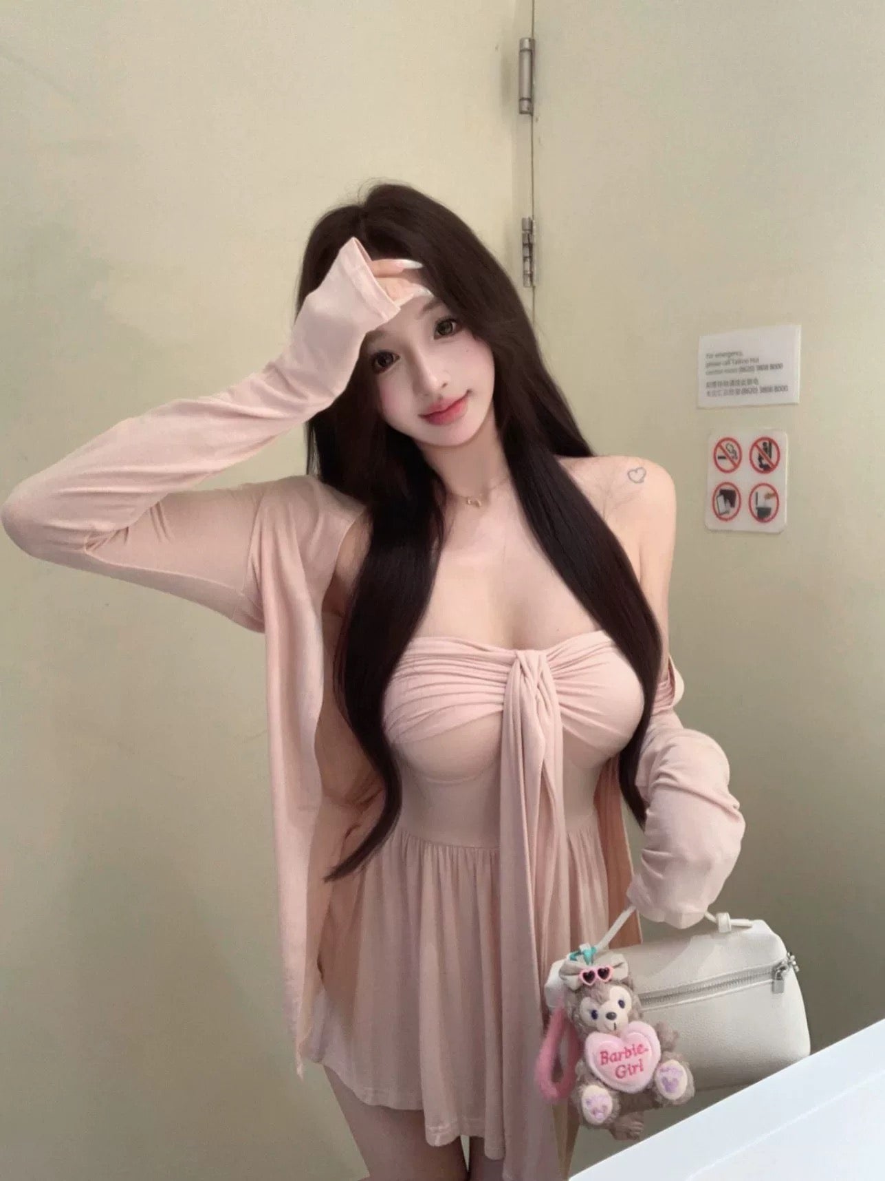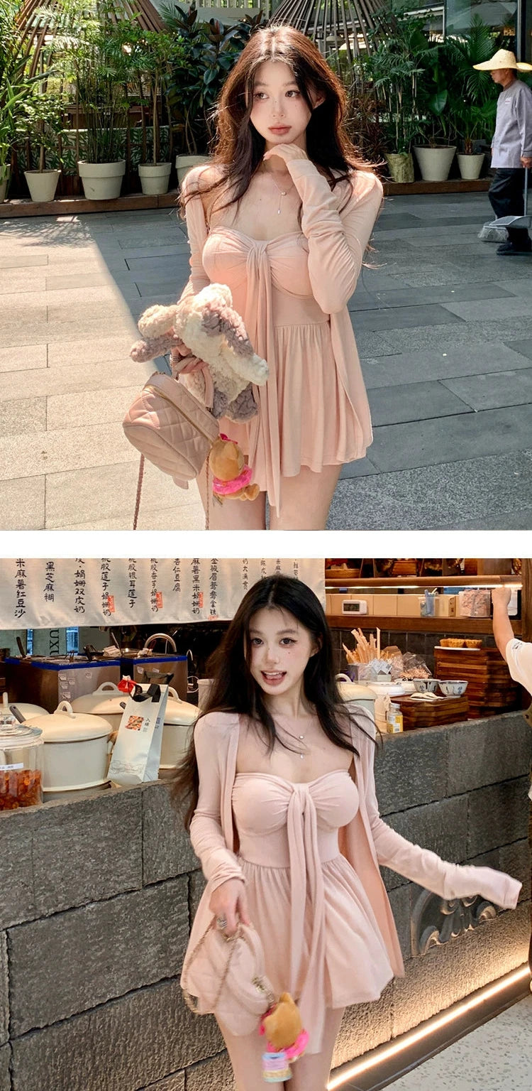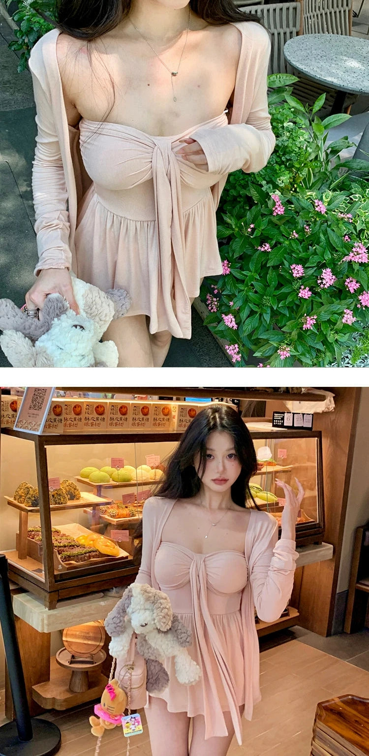 胸元で結ぶリボンデザインがフェミニンな印象を引き立て、