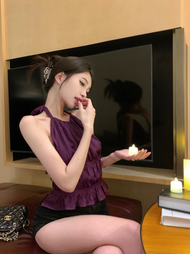 深みのあるプラムカラーが印象的なホルターネックトップ。